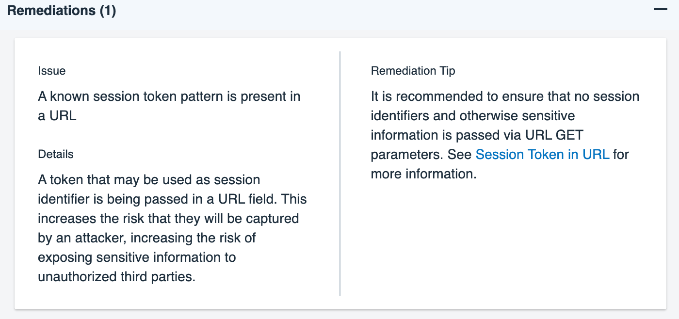 Details: A token that may be used as a session identifier is being passed in a URL field. This increases the risk that they will be captured by an attacker, increasing the risk of exposing sensitive information to unauthorized third parties.
