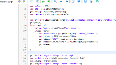 var noDays = 389; //number of days from today’s date; change as desired var gdt = new GlideDateTime(); gdt.addDaysLocalTime(-(noDays)); var lastSeen = gdt.getLocalDate()+""; var gr = new GlideRecordSecure('x_bisit_connector_connector_configuration'); gr.query(); if(gr.next()){ var apiToken = gr.getValue('api_token'); if(apiToken){ var appFilters = gr.getValue('application_filters'); appFilters = JSON.parse(appFilters); appFilters["ITSM"].last_seen = lastSeen; gr.application_filters = JSON.stringify(appFilters); gr.update(); } } gs.info("BitSight Findings Import begin."); var script = new x_bisit_connector.ImportScript(); script.importFindings(); gs.info("BitSight Findings Import complete.");The completed script will look like the screenshot below: - Save the changes and select the Execute Now button.
